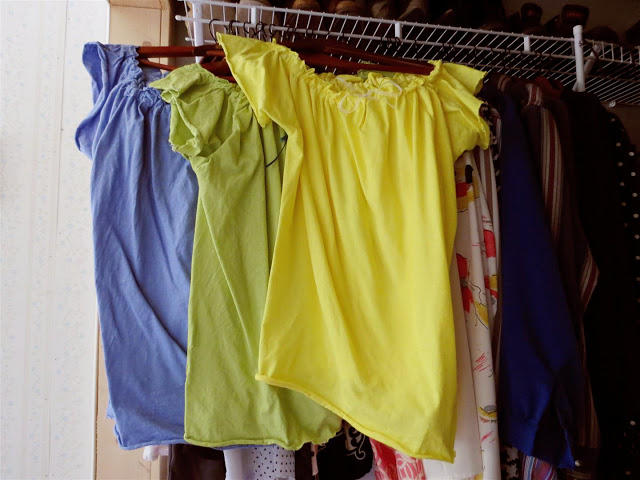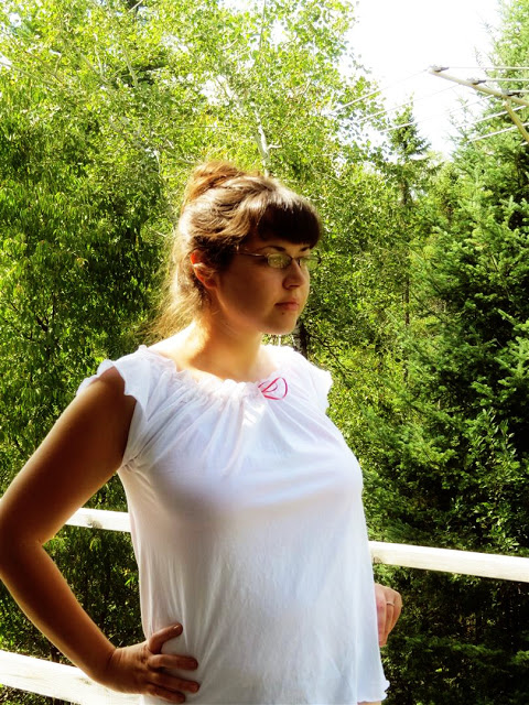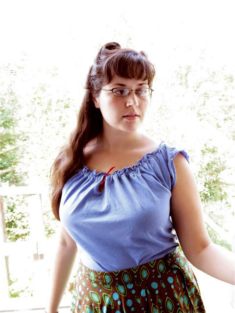 The other day I was in ShopKo and saw a super cute peasant shirt, which I did not buy because I am excruciatingly cheap and it was $11.00. Abe Lincoln is in pain, I am pinching him so hard. To ease my thrifty soul, I decided to sew peasant tops from men’s t-shirts.