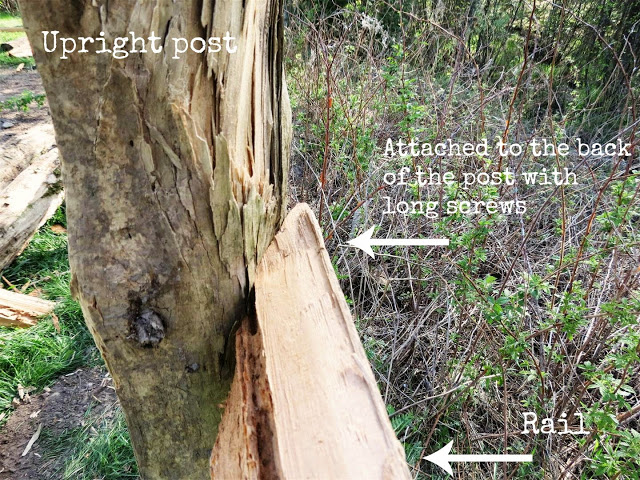 A traditional split rail fence has notches cut into each upright post for the rails to fit into. That sounded like a lot of work. Instead, the ends of the rail pieces were cut at an angle and screwed to the back of each upright.