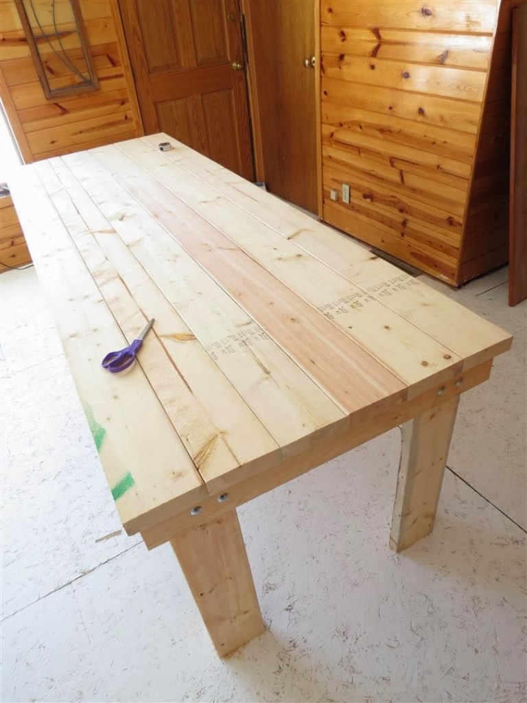 The top of the desk (also made from 2x6s) is removable. It’s held together in one piece by strips of lumber, attached on the underside. The top was then set into the framework, attached to the 2x4s with a few screws, and then bolted to the legs with carriage bolts. If we ever need to move it, we just have to unbolt the top and remove a few screws.