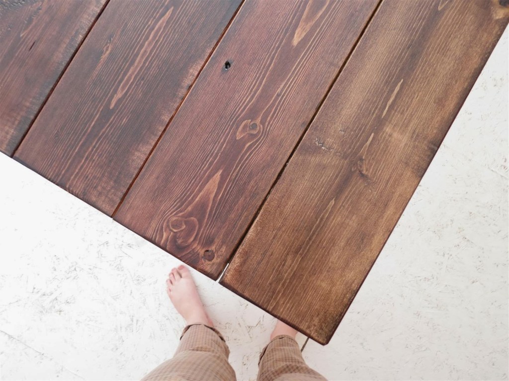 The top was sanded down to smooth it out and remove any lumber-mill labels, and then I (yes, this was my part of the job) stained it with Red Mahogany stain from Minwax. 3 coats of polyurethane later and she was finished.