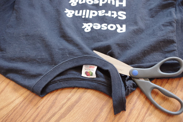 For the sleeves, I cut ’em off. I started about an inch out from the bottom armpit and cut up at a slight angle. Stretch the material out.