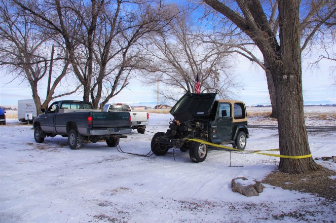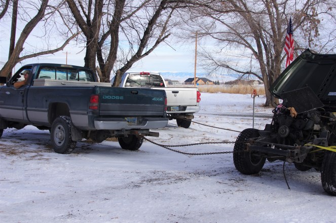 That bar thingy across the front should be, you know, not over to the left. We couldn’t find anyone local to fix it on an actual frame straightening machine. Next best thing: two big trucks and a cottonwood tree.